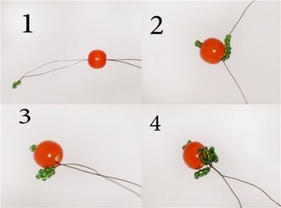 Отрежьте 80 см бисерной проволоки, нанижите на него 3 зеленых бисеринки и оранжевую бусину. Бисерины послужат фиксатором для апельсинки. Минуя бисер, введите оба конца проволоки в отверстие бусины. Сформируйте три листочка вокруг плода, используя петельную технику. Каждая петля должна состоять из 7 бусинок.