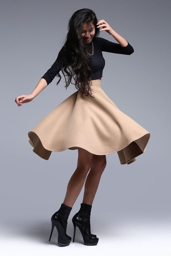Юбка-солнце создаст отличный тандем с блузками, пошитыми из полупрозрачной материи. А вот цвет может быть черным, мятным, серым или лавандовым. К юбке кремового оттенка отлично подходит черный кроп-топ. Придать луку эффектности помогут золотые лодочки. Дополнить образ смогут джемпера, свитшоты, выполненные в черно-белую клетку.