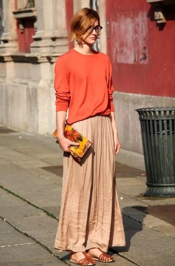 С чем лучше носить бежевую юбку макси? Длинный фасон будет отлично выглядит в тандеме с белым топом или рубашкой. А чтобы внести в образ больше строгости, то достаточно набросить сверху жакет, подходящий под тон низа. В таком сочетании цветов отлично выглядит красный. Он может быть внедрен в образ при помощи сумочки.