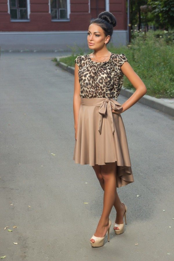 Для повседневных комплектов можно удачно комбинировать бежевую юбку с принтованным верхом. Подойдут рубашки и блузки леопардовых расцветок, полоска, клетка. К длинной бежевой юбке подойдёт кремовый джемпер, белая рубашка, кружевной топ.