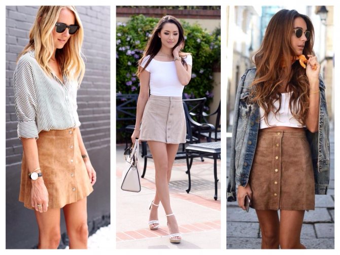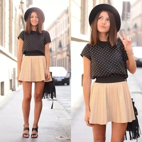 Весьма гармонично смотрится короткая юбка бежевого оттенка с черной блузкой в мелкий горошек. Объёмная сумка с бахромой, черные сандалии и стильная шляпа сделают образ необычным, загадочным и достаточно интересным. Этот вариант подходит для ежедневных городских прогулок и даже похода в клуб.