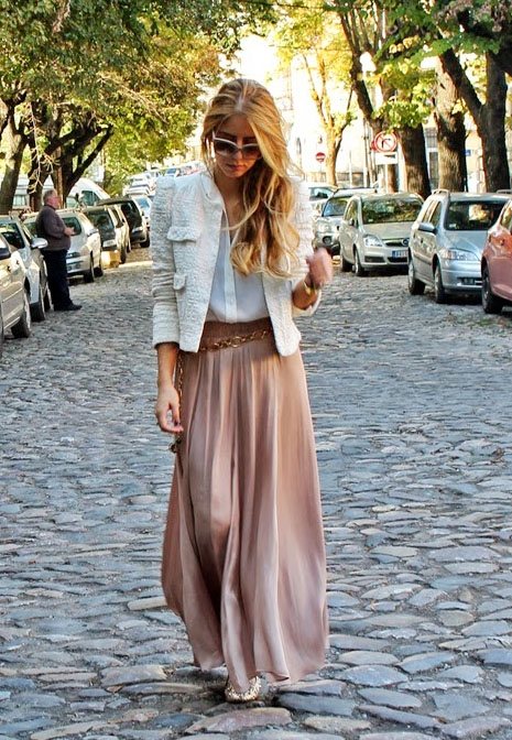 Очень элегантно смотрится юбка макси с белым топом и пиджаком такого же бежевого оттенка. Тонкий черный ремешок, белая сумка, массивное золотистое колье – удачные дополнения во всем облике. Наряд придает своей владелице загадочности и таинственности. Образ достаточно нежный и романтичный.