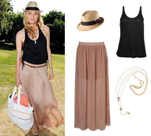 Экстравагантный лук – бежевая юбка макси и чёрная обтягивающая майка. Наряд подойдёт для загородного отдыха жарким летом. Стильная шляпа украсит весь комплект. В качестве аксессуаров наденьте тоненький коричневый ремешок и цепочки.
