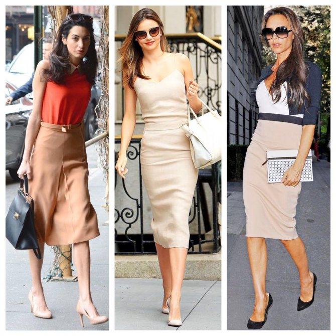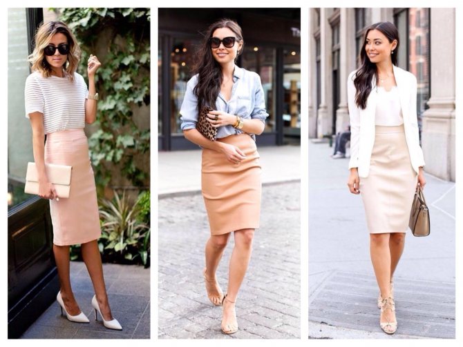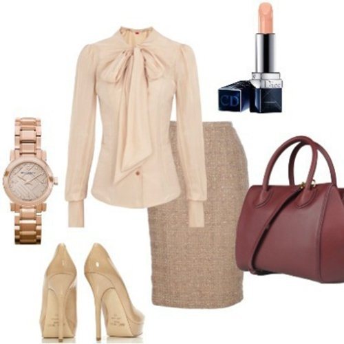 Стиль деловой женщины, по мнению многих людей, это строгость линий и скучный, однотонно серый или какой либо другой мрачный цвет. Однако это не совсем так, и именно бежевый цвет вполне подходит для создания делового стиля. При этом важно чтобы юбка карандаш была допустимой длины, как правило, чуть выше колена или до середины коленной чашечки. Если собирается комплект одежды в этом стиле для работы, где нет строгого дресс кода, то возможен такой вариант