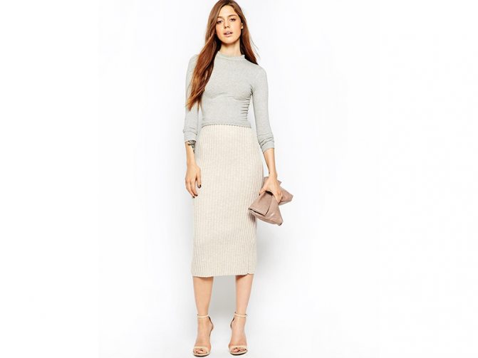 Очень интересно выглядит юбка карандаш. Если посмотреть на многочисленные фото, то можно понять, что с такой одеждой будет сочетаться абсолютно любой верх. Но более выигрышным остается вариант с белой блузкой. Если стало прохладно, то можно накинуть белый жакет. Для завершения лука с прямой юбкой стоит использовать коричневый ремешок и сумку аналогичного цвета. А вот обувь должна быть телесного цвета.