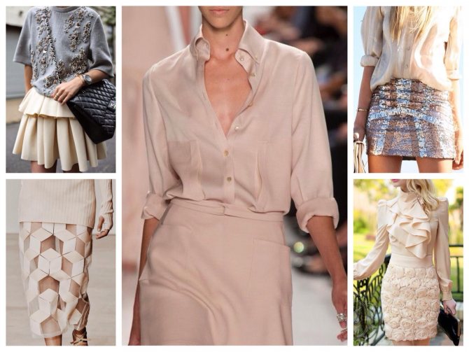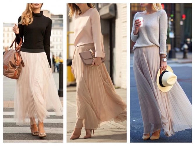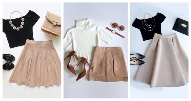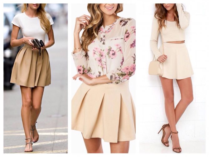 Если вы решили создать образ при помощи бежевой плиссированной юбки, то стоит обратить вариант на длину юбки миди. А вот модель должна быть юбка полусолнце. Таким образом, лук получается приятным и стильным. Для дополнения образа необходимо использовать верх следующих цветов: