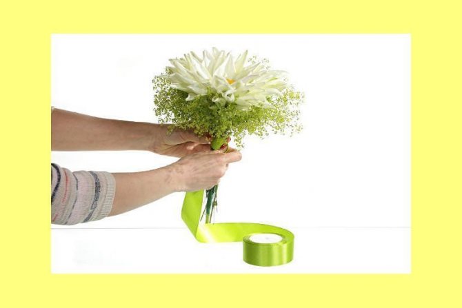 - Ручку портбукетницы обматываем двухсторонним скотчем и украшаем атласной лентой в тон свадебного наряда, кружевом, стразами. Ещё один вариант – использовать для декора натуральные цветочные стебли или их заменитель из берграсса. Такой приём позволяет добиться максимальной естественности и очень актуален у флористов.