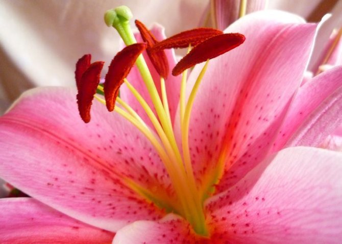 Дополнительную декоративность придает окрас и форма тычинок. Именно от пыльценосов зависит испускаемый динамичный аромат. Самый сильный запах источают кудреватые, трубчатые и восточные гибриды. К закату солнца он усиливается в разы, поэтому ночью спать в помещении с этими растениями небезопасно. Лучше их выносить на открытый воздух, а во время церемоний ставить подальше от гостей и чаще проветривать помещение.