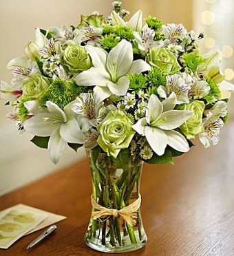 Следующее фото букет белых лилий. Их ослепительно белая красота подчеркнута нежно желто-зелеными розами.