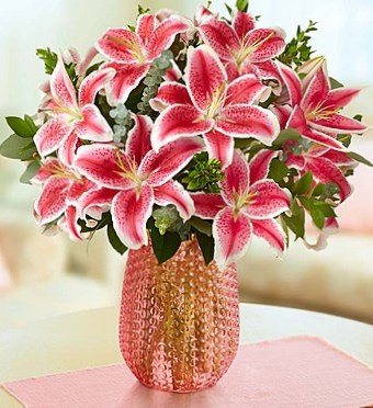 Конечно, композиция ярко розовых крупных цветов не оставит равнодушными никого. Лепестки лилий вытянуты и изогнуты, а окраска с белых краев до густо-розовой в центре.