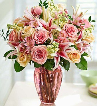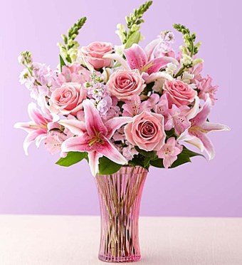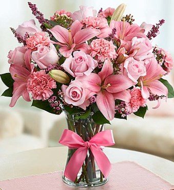 Какое торжество розового в нежных оттенках композиции роз, лилий и гвоздик. Эффект дополняет пышный розовый бант на вазе.