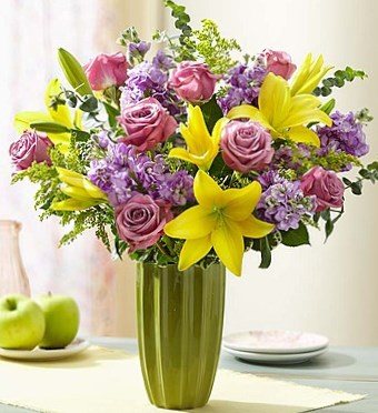 Необычайно яркий и по-летнему роскошный букет лилий, роз и других цветов. Его не надо еще украшать, достаточно простой стеклянной вазы.
