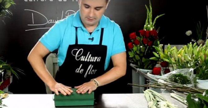 - Сначала опустим оазис в воду, чтобы он хорошо увлажнился, ведь именно это нехитрое приспособление создаёт комфортную среду для свежих растений. Когда губка потемнеет и опустится на дно, её извлекают и помещают в портбукетницу, закрепляя проволокой. Ножку пластмассовой подставки набивают бумажными полотенцами, чтобы вода не просачивалась наружу.