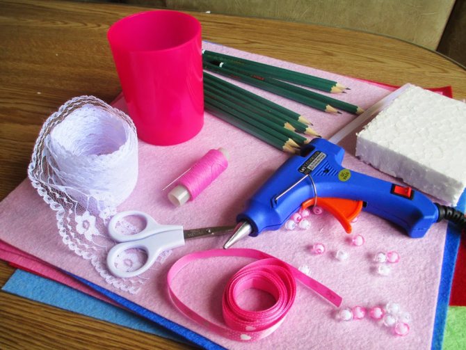- скотч двухсторонний, клеевой пистолет, острый нож, проволока.