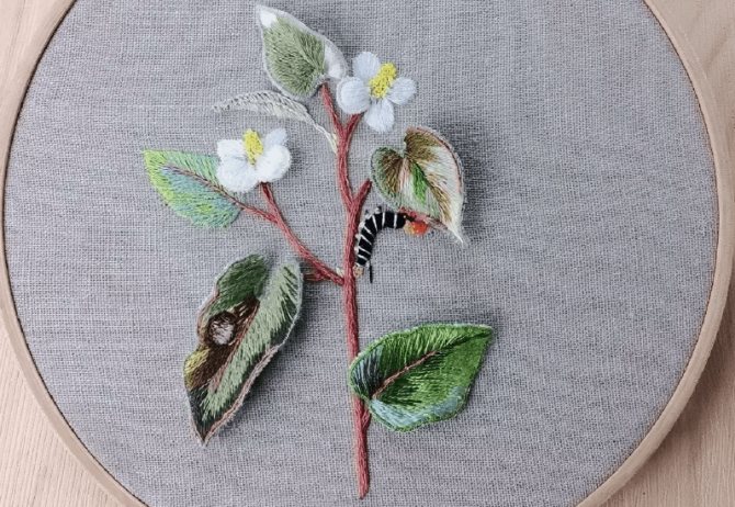 Этапы вышивки бабочки гладью в технике stumpwork:
