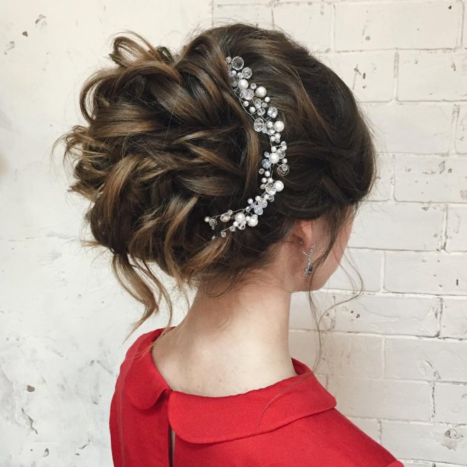 Для высокого пучка актуальна небольшая небрежность. Можно выпустить несколько прядей или распушить его. Высокий пучок удлинит силуэт и шею. Подойдет к любому платью от бюстье до фасона со стойкой и длинным рукавом. Украсьте его красивым аксессуаром (диадемой, ободком, шпильками, крабом) или цветком, слегка закрутите прядки — образ станет игривым и романтичным.