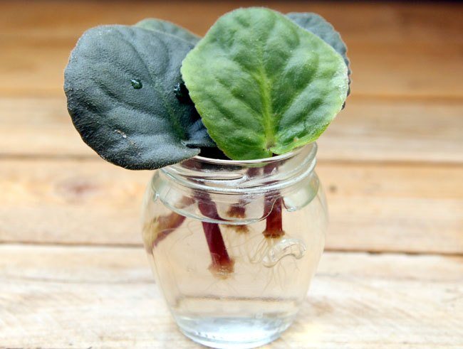 Существует несколько вариантов размножения фиалки Свадебный букет. Один из них — с помощью черенков. Использовать нужно листья среднего ряда розетки. Можно сразу поместить листовой черенок в подготовленную рыхлую почву, а можно сначала поставить в воду и подождать пока появятся корни.