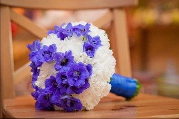 - Использование махровых белоснежных цветов с синей окантовкой на лепестках будет выигрышно сочетаться с белоснежным убранством девушки.