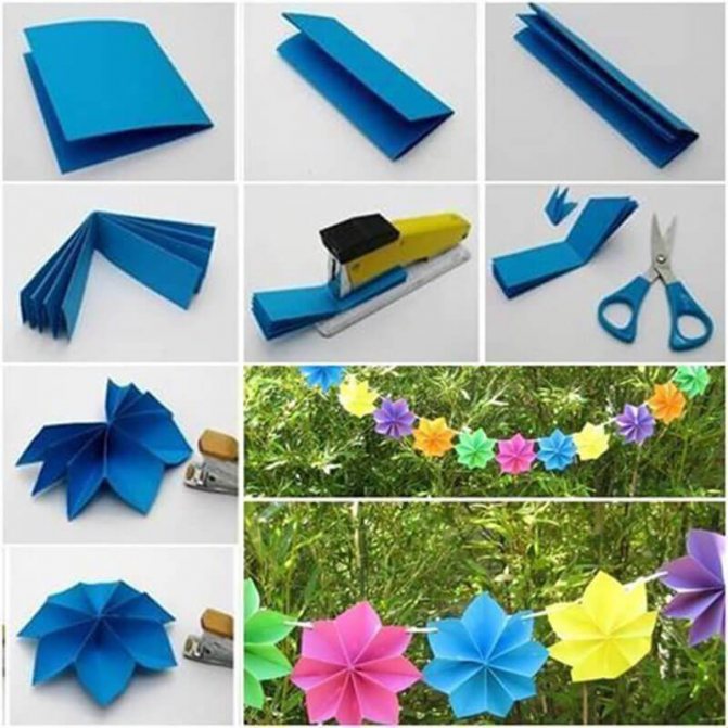 Самый простой способ создания цветочного украшения – из плотных разноцветных листов бумаги: