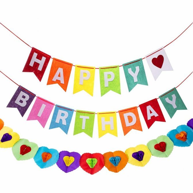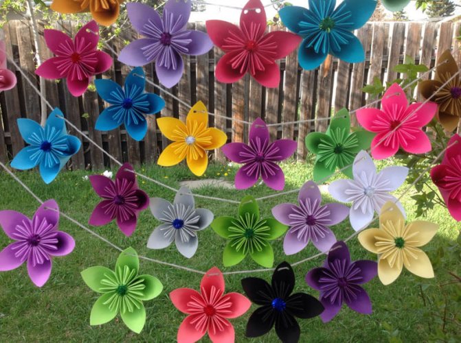 Из цветной бумаги можно сделать плоские украшения по типу флажков или объемные – в виде цветов, шаров, помпонов. Для скрепления элементов используют нитки или прозрачный клей.