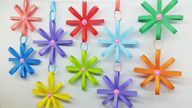 Сначала вырезают разноцветные полоски бумаги одинаковой длины. Затем одну полосу склеивают в кольцо. Потом, продевая в него следующий цветной кусочек, клеят снова.