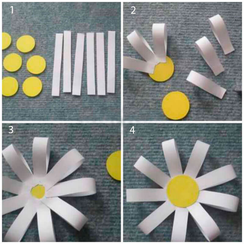 - Чуть более сложный вариант — вырезать отдельные лепестки и кружок для сердцевины. Склеить сначала эти детали, а потом с изнаночной стороны приклеить их на нить на одинаковом расстоянии друг от друга.