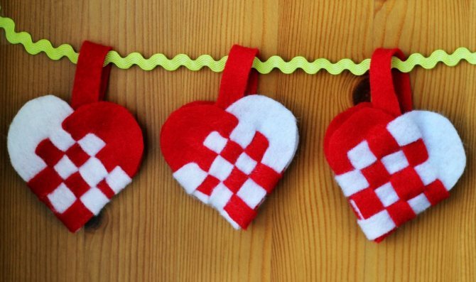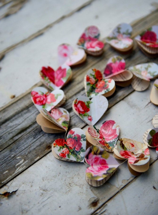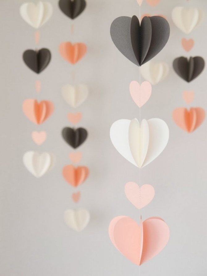 Оригинально будут смотреться гирлянды, если все сердца на одной ниточке будут разных форм, объёмов и оттенков (розовый, белый, малиновый, красный).