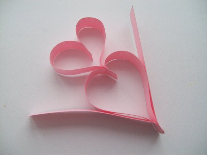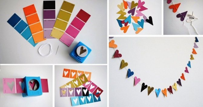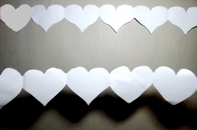 Также можно склеить цепочку, придав колечкам форму сердец. Терпеливых мастериц заинтересует вариант ажурных сердечек, протянутых через ниточку. Смотрятся они нежно и невесомо.