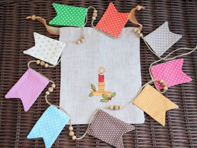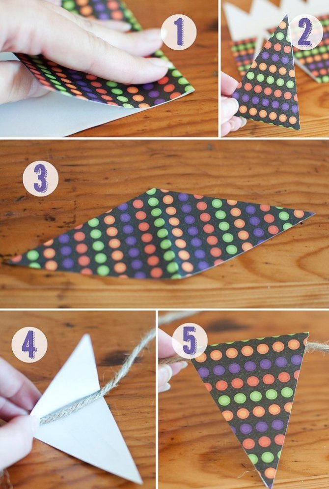 Из бумаги вырезать прямоугольники размером 10х20. Отрезать длинный кусок нити. Закреплять прямоугольники, сложив вдвое и склеив скотчем с внутренней стороны. После этого на каждой фигуре сделать V-образный вырез, чтобы получился флажок. Гирлянда готова. Используя данный метод, можно сделать гирлянду из букв и слов.