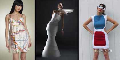 Весьма уникальным выглядит платье из газет, картона и географических карт. Но надо очень постараться, чтобы в таком платье можно уйти куда-то дальше примерочной.