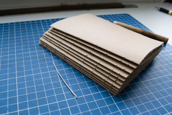 17. Когда переплет готов, мы получили внутреннюю часть блокнота. Теперь можно приклеить форзацы из крафт-бумаги.