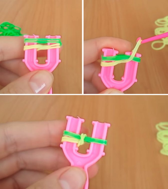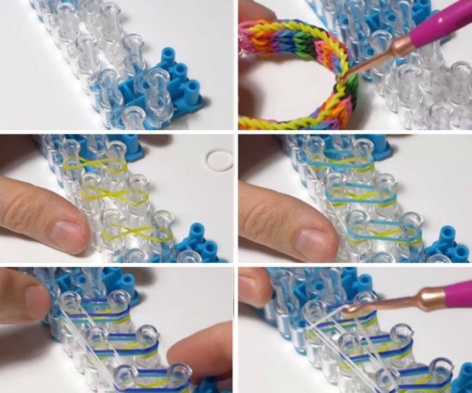 После того как выбрана определённая схема, согласно ей на столбцы накидываются резинки, а затем с помощью крючка снимаются и перекидываются в определённом порядке. Действия несложные, главное внимание и усидчивость.