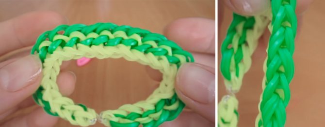 - На сдвоенную резиночку надевают клипсу и соединяют с противоположным концом браслета.