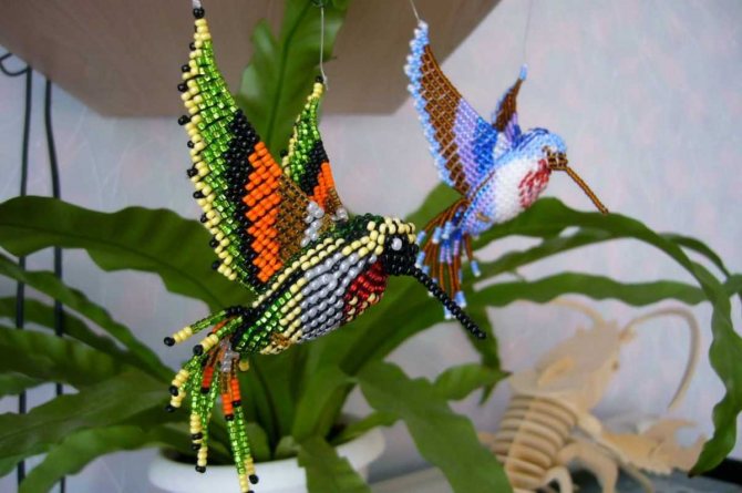 Для того, что бы сплести птичку колибри в объемном виде запаситесь проволокой 1,2 м длинной. Начинаем работу с клюва и техники плоского плетения. Продолжаем по методу объемного параллельного плетения. Лапы и крылья будут следующим этапом. Для этого протягивается проволока внутри туловища птицы из бисера из расчета две для лапок, две для крыльев. Крылья будут выполнены в технике плоского плетения, а лапки – объемного. Еще один отрезок, протянутый под последним рядом туловища, будет для хвоста. При помощи плоского плетения нанизываем бисер, а кончики скрещиваем. Начиная с пальца, который смотрит назад, нанизываем пальцы птицы из бисера. Завершаем процесс бисероплетения, протягивая проволоку вперед через весь ряд бисера. И продолжаем нанизывать бисерины для оставшихся пальцев. Скручиваем кончики и лишнее обрезаем.
