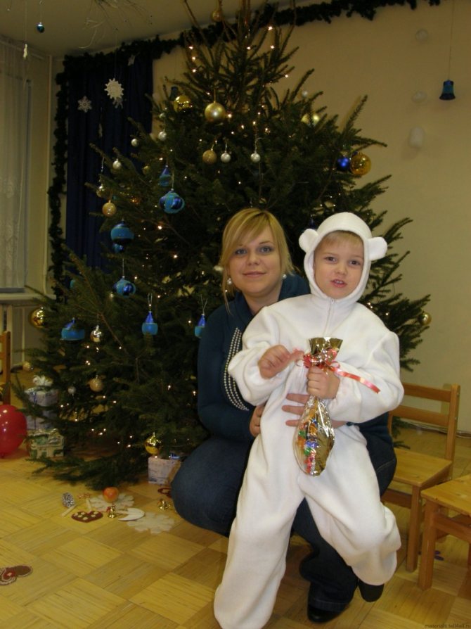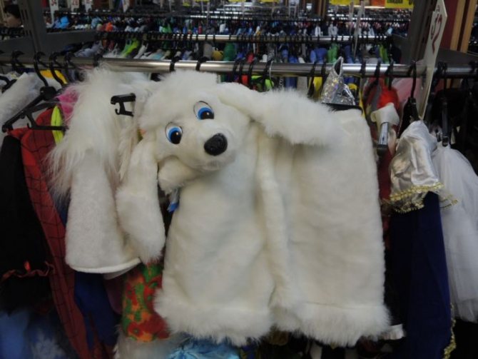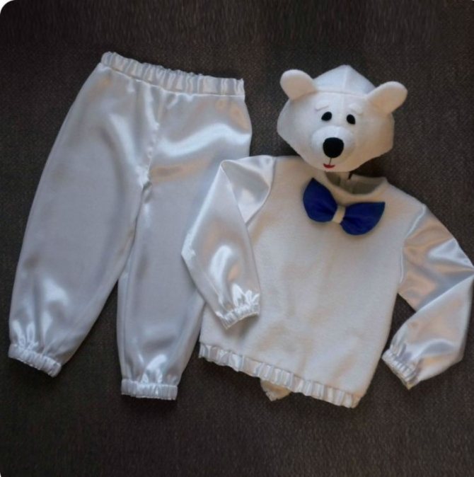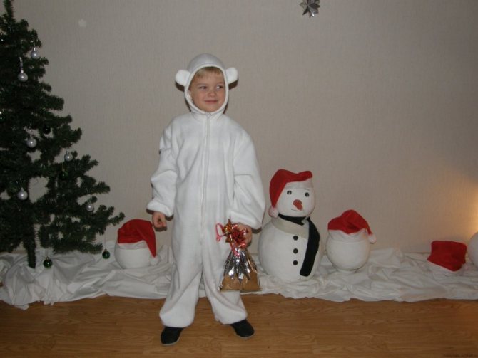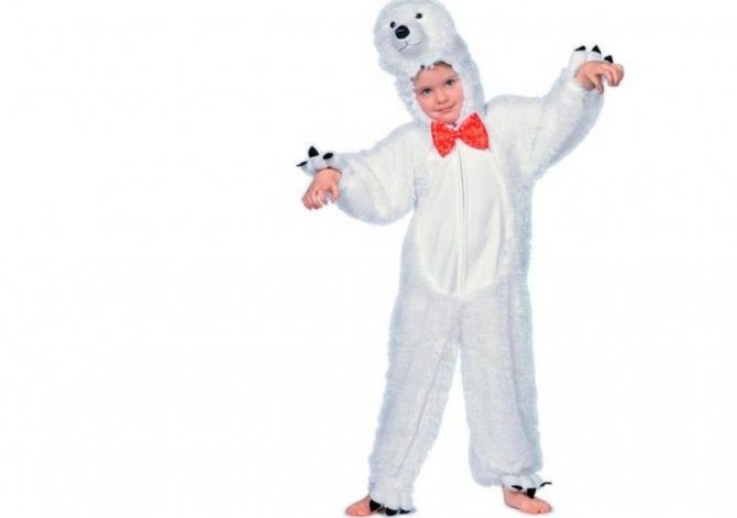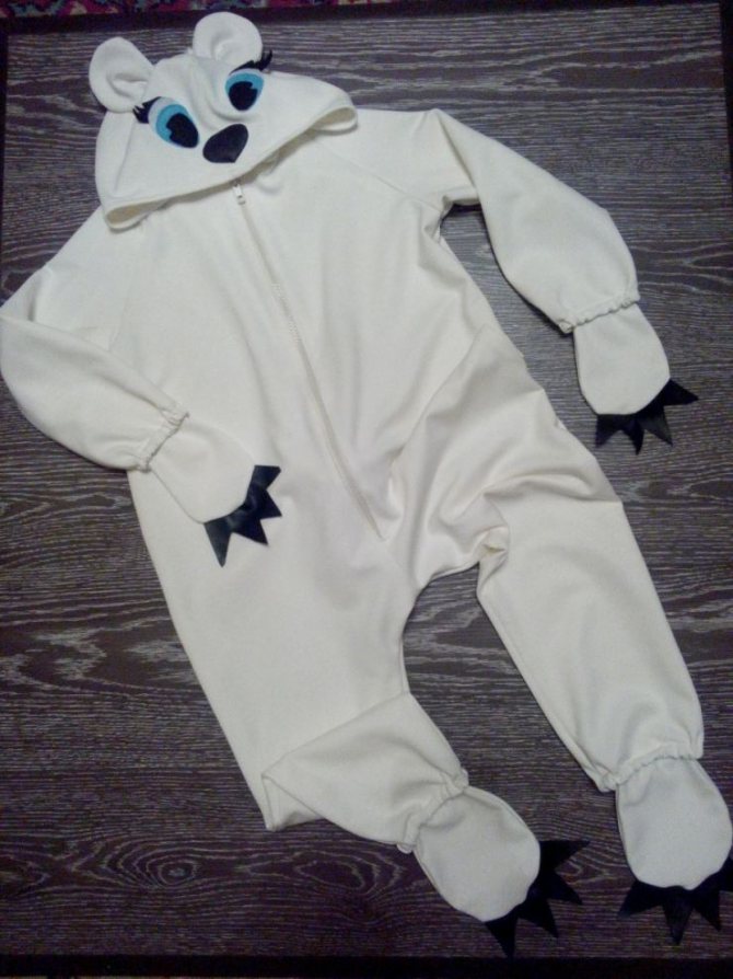 Интересный экспресс-метод создания костюма белого медведя подойдет для родителей малышей лет 2-х. Чтобы его воплотить в жизнь, нужен большой игрушечный белый медведь, равный по росту Вашему ребенку. Осторожно у игрушки распускается несколько швов: тот, что соединяет голову и туловище, и средний, либо боковой. Как только медведя удастся «раскрыть», из него вынимается весь набивающий его материал, и игрушка простирывается вручную.