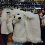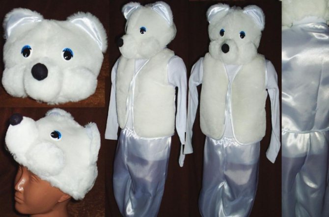 Последний быстрый вариант детского костюма белого медведя уже не ориентирован на переделку старых вещей, но имеет простую технологию пошива, поэтому любой маме будет под силу. Весь костюм будет состоять из жилетки, коротких штанишек, шапочки и рукавичек. О том, как соорудить последние 3 элемента, выше было подробно рассказано. Если у Вас нет возможности сделать полноценную шапочку, можно обойтись простыми круглыми ушками, набитыми ватином, и прикрепленными к пластиковому ободку, который обязательно обтягивается соответствующей тканью.