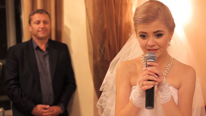 Дорогие мои, мама и папа! Хочу отдельно высказать вам огромную благодарностьза то, что помогли организовать для нас этот праздник. Вы помогли мне стать таким человеком, которым все меня знают и видят сейчас: добрым, воспитанным, образованным, культурным. Спасибо, что никогда не теряли веру в меня и всегда поддерживали в трудных ситуациях. Я хочу сказать, что мне безумно повезло быть вашей дочерью, получать вашу любовь и ласку. Обещаю не терять себя и всегда помнить вас, помогать и проводить с вами время, но теперь уже в другом статусе, в статусе «счастливой жены»!