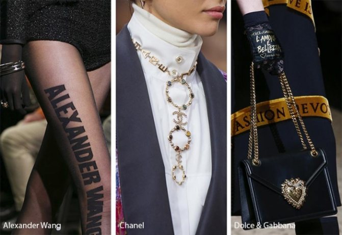 Следующей модной тенденцией можно отметить аксессуары в виде логотипов. Очень популярными являются фирменные знаки именитых брендов на одежде или обуви. Так почему не перенести их в украшения? Различные браслеты, кольца, ремешки и очки в виде логотипа одного из модных домов смотрятся очень модно и дополняют образ. Дизайнеры советуют не скромничать при выборе таких украшений. Буквы или знаки должны быть большими, чтобы было заметно. Таким образом, можно показать поклонником какого бренда Вы являетесь.