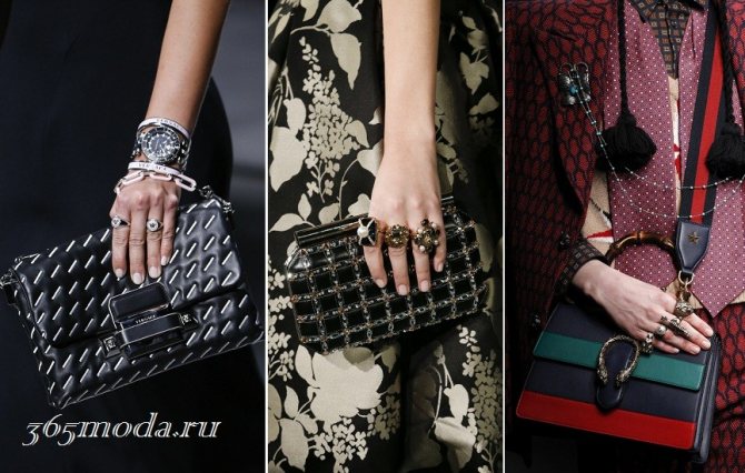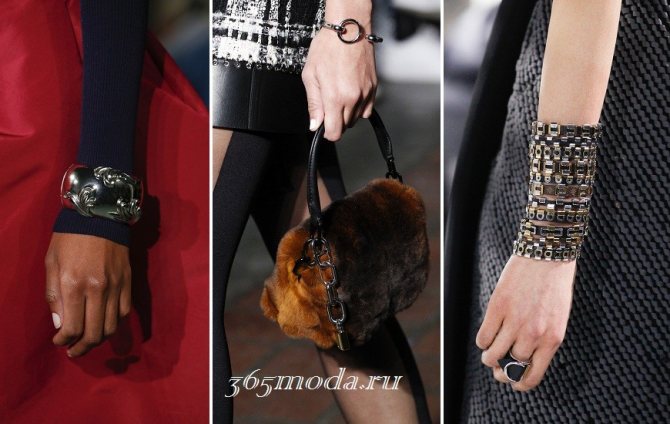 Как ни странно, но браслетов на модных осенне-зимних показах было не так много, как в прошлых сезонах. В основном присутствовал один вариант — крупные, объемные браслеты. Носить их нужно в паре с тонкими или такими же массивными браслетами. Браслетная многослойность сейчас особо актуальна. Желательно подбирать «дутые» браслетики. Но и широкие плоские аксессуары на запястьях смотрятся весьма изысканно, пример — браслет от Chloé. Он сложен из нескольких рядов квадратных пластинок и отлично подойдет к модной обуви в стиле металлик.