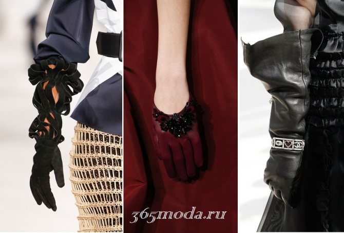 Помимо вечной классики — кожаных перчаток базовых оттенков (черный, темно-синий, коричневый, бордовый) стилисты советуют обзавестись креативной парой. В этом сезоне это митенки, модели перчаток из металлизированной кожи, украшенные кристалами, укороченные перчатки с интресными разрезами или перфорацией. Не менее модная длина перчаток — до локтя и выше. Эти перчатки отлично смотрятся с пальто с укороченными рукавами, тогда крупные часы или браслеты стоит надеть поверх перчаток.