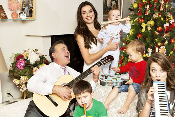 Мария Ситтель с сыновьями Колей (на руках у мамы), Саввой, Иваном, дочкой Дашей и папой Эдуардом Анатольевичем. Елка предоставлена ивент-агентством «Николя Тибо». Дизайнер Ханна Эскендирова
