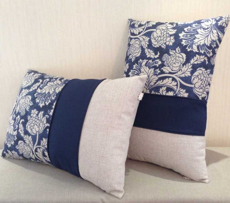 Корме стандартных способов украшения, наволочки на диванные подушки изначально могут быть сшиты из лоскутов ткани, что заменит эффект аппликации. Этот способ более сложный, но и экономичный. Можно использовать ненужные кусочки ткани или образки от других изделий.