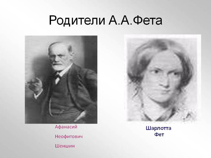 В детстве А.Фет испытал потрясение — его лишили дворянского титула и отцовской фамилии. Настоящая фамилия писателя Шеншин, его отец — отставной российский ротмистр, а мать — немецкая красавица Шарлотта Фет.
