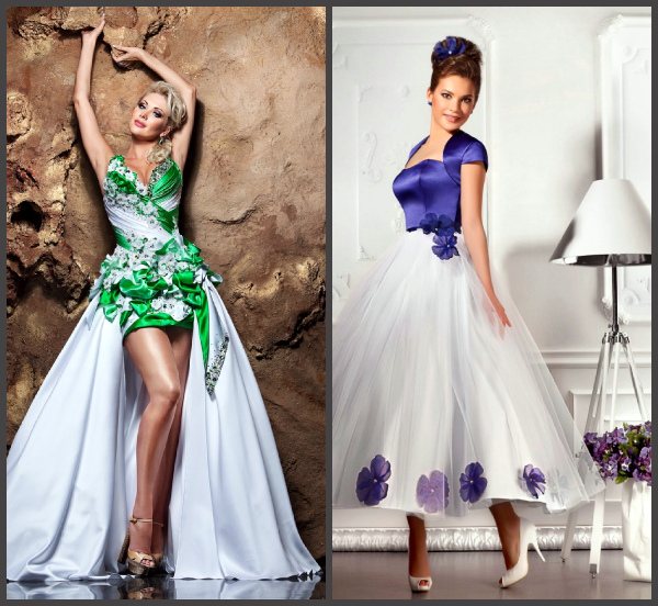 В последнее время вошли в моду двуцветные наряды для невест. Это может быть светлое платье с единственным ярким акцентом в виде пояса или вышивки на подоле или, наоборот, цветное платье с белой отделкой.
