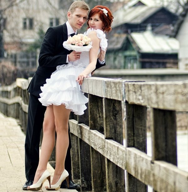 - Короткий свадебный наряд, открывающий великолепные ножки невесты, смотрится гораздо сексуальнее, чем традиционное длинное платье. Если есть что показать, то зачем скрывать это под длинной и объемной юбкой;