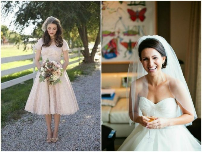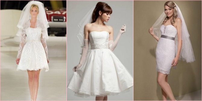Традиционный атрибут на голову невесты тоже будет замечательно смотреться с укороченными платьями, стоит лишь его правильно подобрать. Например, до пола здесь точно будет неуместна.