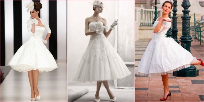 Пышное свадебное платье миди – идеальный вариант для тематического торжества в стиле ретро. Недлинные наряды А-силуэта были особенно популярными на заре своего появления в 50-е годы прошлого века. Поэтому этот фасон больше всего ассоциируется именно с послевоенной эпохой. Пышное платье миди позволяет создать красивый винтажный образ а-ля Мэрилин Монро, Бриджит Бардо, Одри Хепберн или другой известной кинодивы того времени.