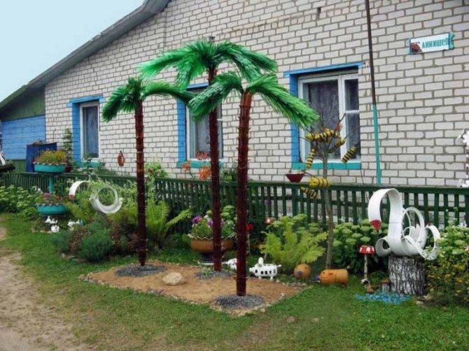 Процесс разложения пластикового материала длится в течение 100 лет. Чтобы не загрязнять окружающую среду, в любом районе налажен вывоз отходов из пластика. Но есть некоторые дачные участки, из которых вывоз отходов не производится. В этом случае добросовестные дачники вывозят бутылки самостоятельно. Чтобы не делать лишнюю работу по вывозу, за один вечер можно изготовить из пластмассовых бутылок пальму. Достаточно собрать на участке всю разноцветную тару. Пальмами можно украсить: