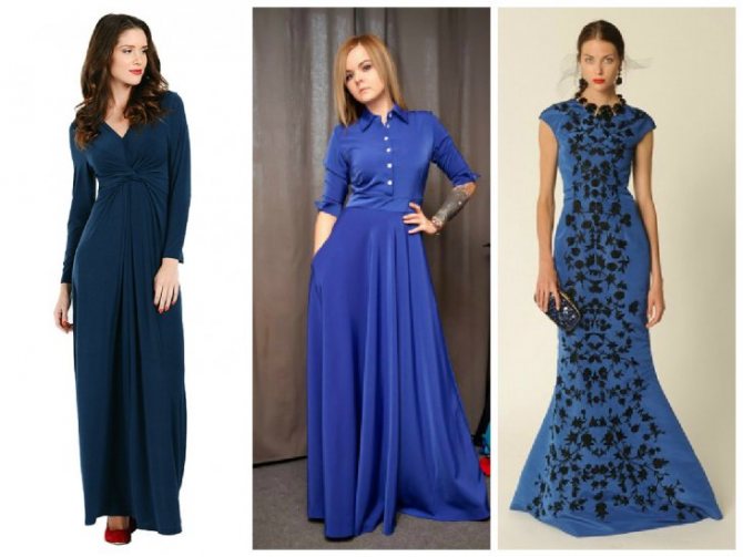 Синее платье выглядит одновременно сдержано и нарядно. Легкое синее изделие шикарно подходит для летних прогулок. Отделку с украшениями можно выбирать в тон или светлее/темнее самого платья. Модным трендом этого сезона является плавный переход из разных оттенков синего цвета в виде градиентного принта.