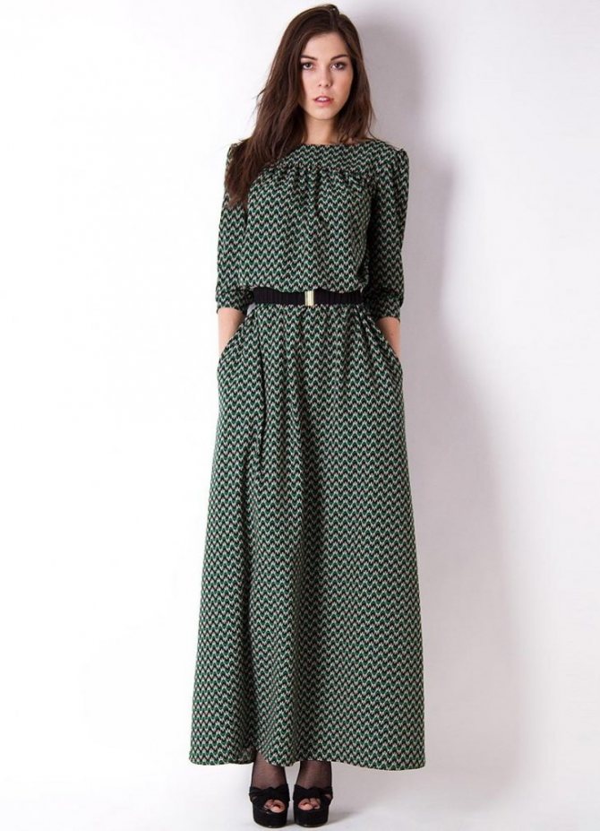 Элегантное платье – макси прекрасно дополнят небольшие по размеру, изящные аксессуары в виде шарфа из лёгкой материи, ридикюля, аккуратной вечерней дамской сумочки.